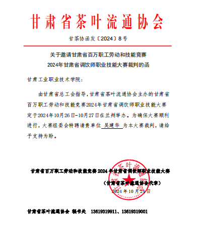 10月27日在兰州闭幕的甘肃省百万职工劳动和技能竞赛2024年甘肃省调饮师职业技能大赛中,我院高级茶艺师吴建华应邀担任评委。