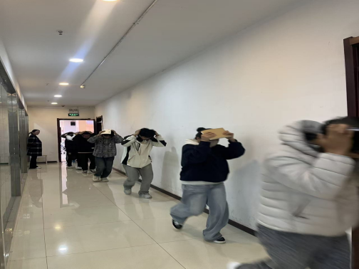 实战演练环节,随着尖锐的警报声响起,学生们迅速做出反应,用书包、书本护住头部,蜷缩身体,动作规范。待警报声暂停,疏散指令下达,学生们在学管老师和学生志愿者的引导下,沿着规划好的路线,低姿弯腰、快速有序地撤离至红色大厅外的安全集合点。整个演练过程紧凑高效,秩序井然,仅用时2分钟,全体学生便完成疏散,且无任何意外状况发生。