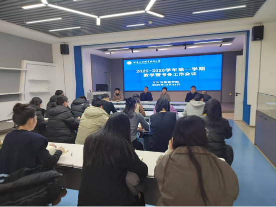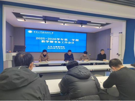 为统筹推进学期末教学收尾工作,规范考试流程,明确各项任务要求,12月24日下午,文化与旅游学院在智慧旅游C+实训室一楼会议室召开2025-2026学年第一学期教学暨考务工作会议。会议由副院长主持,学院领导班子及全体教职工参加。