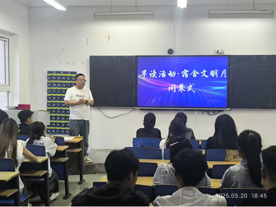 5月20日,旅游学院为期一个月的早读活动和宿舍文明月活动在热烈的氛围中圆满结束。在闭幕式上,殷老师对活动进行了全面的总结,并对在活动中表现突出的宿舍文明月优秀宿舍集体和早读活动先进个人进行了表彰。