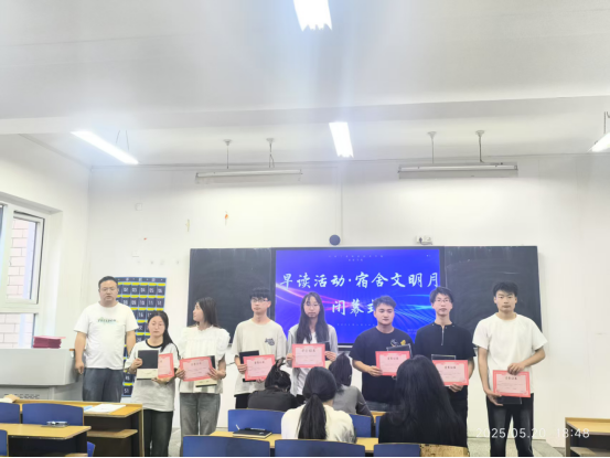 最后,殷老师为早读活动先进个人和宿舍文明月优秀宿舍集体颁发了荣誉证书和奖品,以表彰他们在活动中的杰出表现。