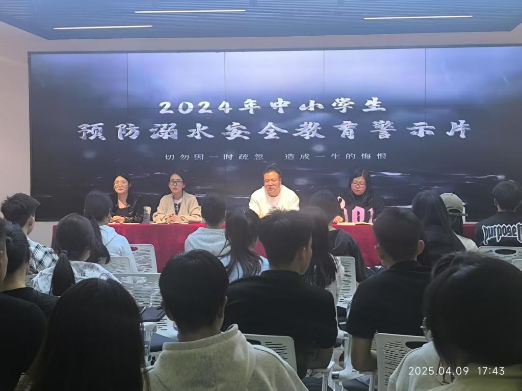 活动伊始,旅游学院团总支书记殷达老师担任主讲。他结合真实案例,从“溺水风险识别”、“水域活动安全准则”、“自救与他救技能”三大模块展开讲解,重点剖析了野外水域隐患、抽筋应对措施及心肺复苏操作要点。殷老师强调:“溺水事故多因侥幸心理和盲目施救引发,科学防范与冷静应对是关键。”随后,全体师生共同观看《防溺水安全教育警示片》,视频通过模拟场景与事故回放,直观呈现危险场景的正确处置方式,进一步强化学生的风险认知。