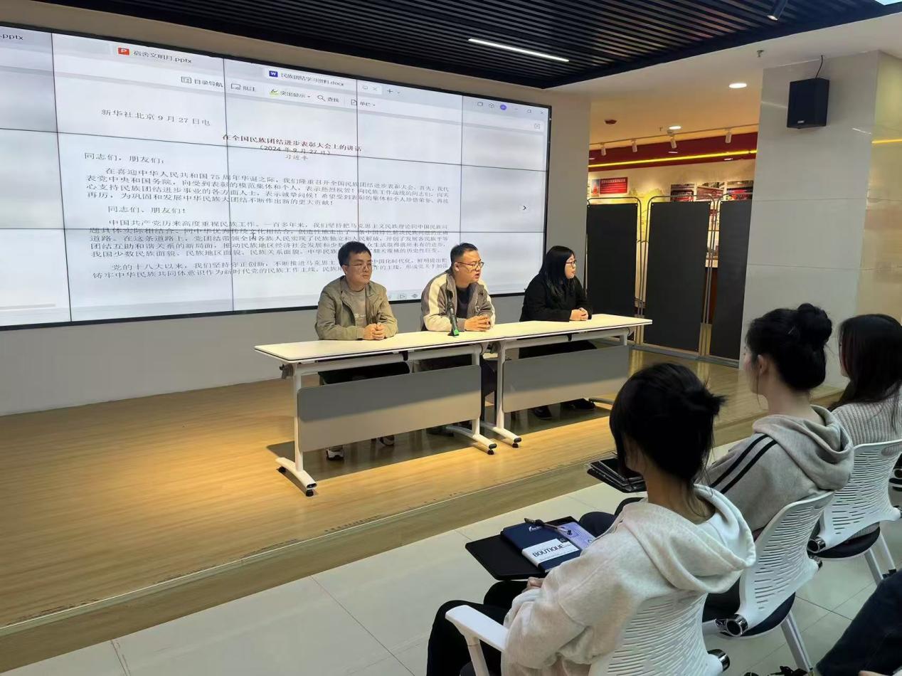 活动伊始,学院团总支书记殷达老师引导在场的所有人深入学习了习近平总书记在全国民族团结进步表彰大会上的重要讲话精神,并随后观看了“同心共筑中国梦”主题纪录片。殷达老师强调了旅游学院学生党支部在引领团学活动中的重要性,指出只有通过党建的引领,才能更有效地推动团学活动的发展。