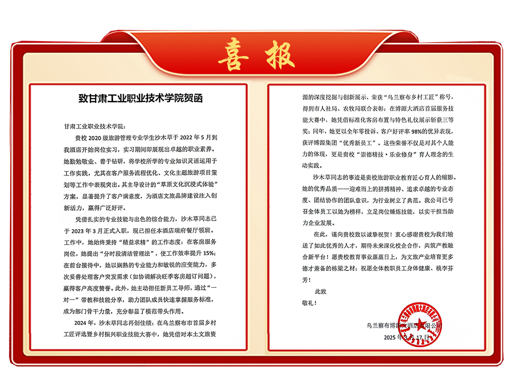 欣获内蒙古乌兰察布博源大酒店有限公司发来的贺函,生动诠释了我校旅游学院2020级旅游管理类专业学生沙木草,以卓越的职业素养和创新实践,在实习期间便崭露头角,主导设计的“草原文化沉浸式体验”方案赢得业界广泛赞誉。转正后,她精益求精,从优化服务流程到带队新人,成为博源大酒店的中坚力量,更在乌兰察布市技能大赛中斩获“乡村工匠”称号,全年零投诉、好评率98%的佳绩诠释了何为“崇德精技·乐业修身”。她的成长之路,是职业教育与行业需求深度融合的典范,更是激励全体师生见贤思齐的鲜活榜样。