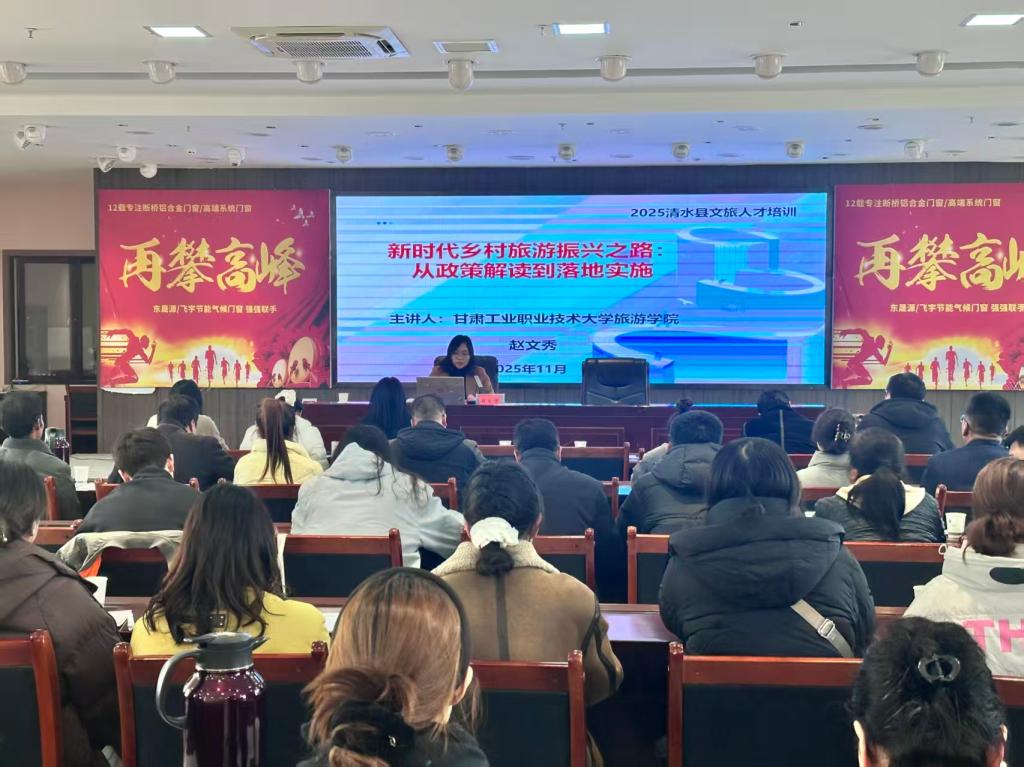 为深入贯彻党的二十届四中全会关于全面推进乡村振兴的决策部署,落实国家“十四五”文化和旅游发展规划,11月19日,我校旅游学院旅游管理专业主任赵文秀应清水县邀请,为该县2025年文化旅游人才培训班作《新时代乡村旅游振兴之路:从政策解读到落地实施》专题讲座。此次培训是我校发挥文旅教育资源优势、精准对接地方发展需求、服务乡村振兴战略的生动实践,也是推动旅游职业教育融入农业农村现代化的有力举措。