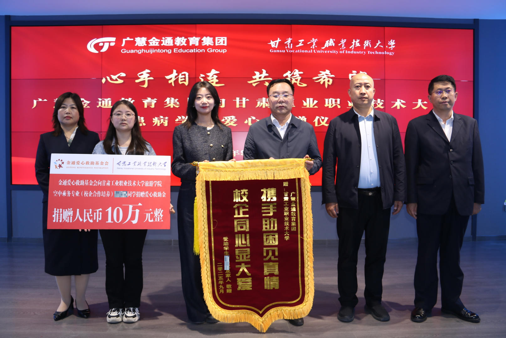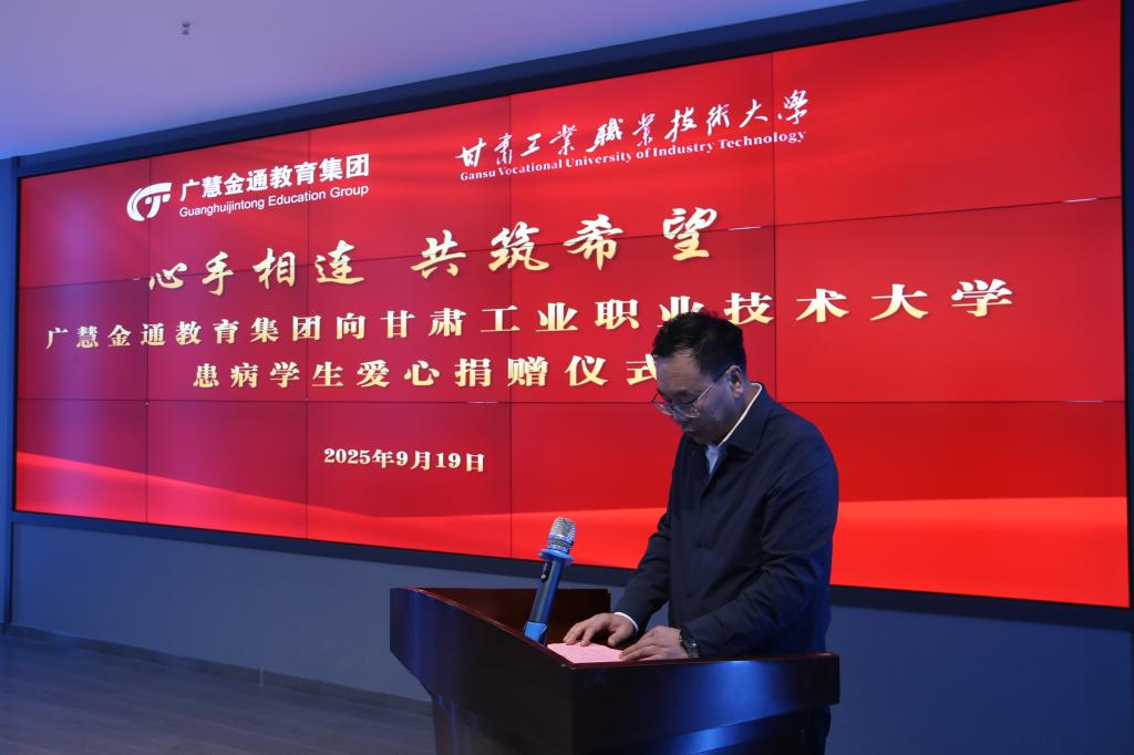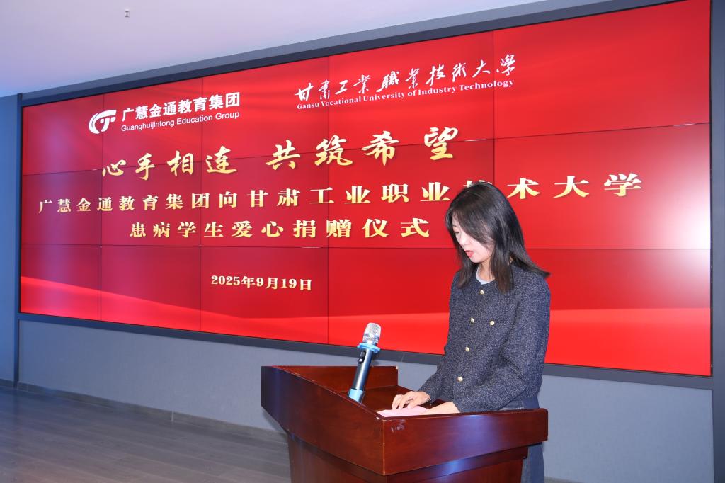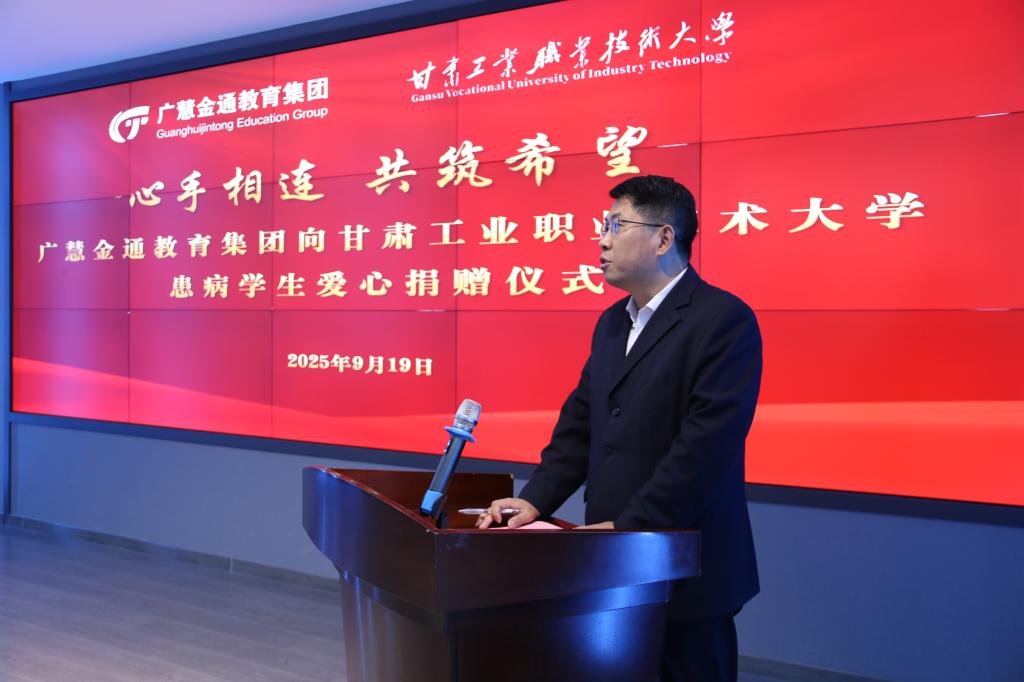 9月19日,广慧金通教育集团在甘肃工业职业技术大学智慧旅游实训基地举办了一场温暖的爱心捐赠仪式。学校党委常委、副校长文云,学工处处长马学成,广慧金通教育集团甘青区域总经理苗雪、驻校工作处主任刘涛涛,旅游学院班子成员以及师生代表共同出席,凝聚校企爱心,传递人文关怀。
