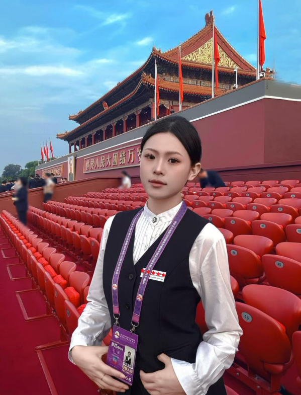 在纪念中国人民抗日战争暨世界反法西斯战争胜利80周年这一重大历史时刻的阅兵仪式上,旅游学院2023届空中乘务专业毕业生王乐作为东红观礼台安保人员,以出色的专业素养圆满完成了这项光荣使命,展现了新时代中国青年的风采。这份荣耀不仅是对王乐同学个人能力的肯定,更是我校坚持党的正确教育方针、落实立德树 人根本任务的重要体现。