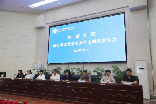 为强化学生诚信意识与安全观念,营造公平、公正、安全的学习、考试和生活环境,7月1日,旅游学院在智敏报告厅召开“诚信考试暨学生安全主题教育大会”。会议聚焦“从细节入手筑牢教风、学风、考风与安全防线”,为考试季与暑期安全工作划定“行动指南”。院长李玉林主持会议,学院领导班子、全体教师、辅导员及全院学生参会。