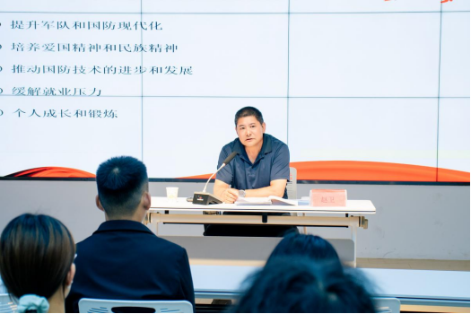 随后,武装部副部长赵卫老师围绕大学生入伍的意义、优惠政策、报名流程及发展规划等方面进行了详细解读。他介绍,大学生入伍可享受学费补偿、专升本加分、缓解就业压力等多项政策红利,部队还为大学生士兵提供了广阔的成长空间,通过军事训练、专业学习和实践锻炼,可培养出坚韧不拔的品质、高效的执行力和团队协作能力,这些经历将成为人生中宝贵的财富。