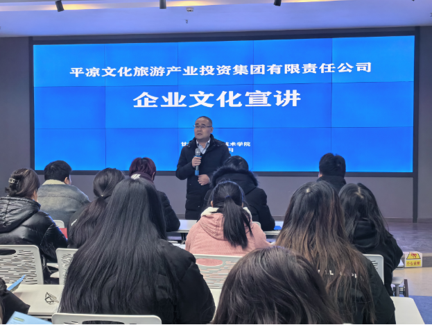 为了进一步推进校企合作,提高就业质量,12月28日上午,平凉文化旅游产业投资集团有限责任公司党委书记、董事长何永刚一行走进旅游学院进行专场招聘会,全体21级旅游管理、导游专业共计150余名学生参加。